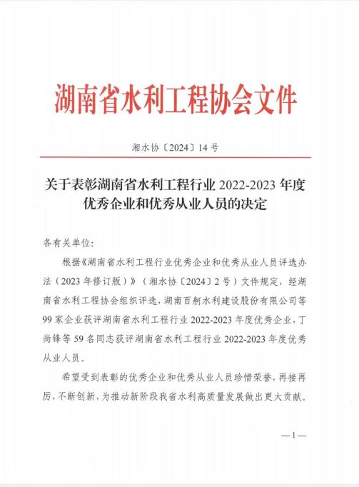 2024年6月,湖南華緯水電有限公司榮獲湖南省水利工程行業(yè)“優(yōu)秀企業(yè)”的稱號,這一殊榮不僅彰顯了其在水利工程領域的卓越實力,也體現(xiàn)了其對于行業(yè)發(fā)展的積極貢獻。