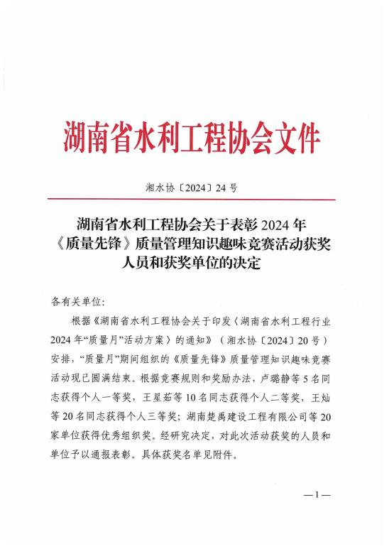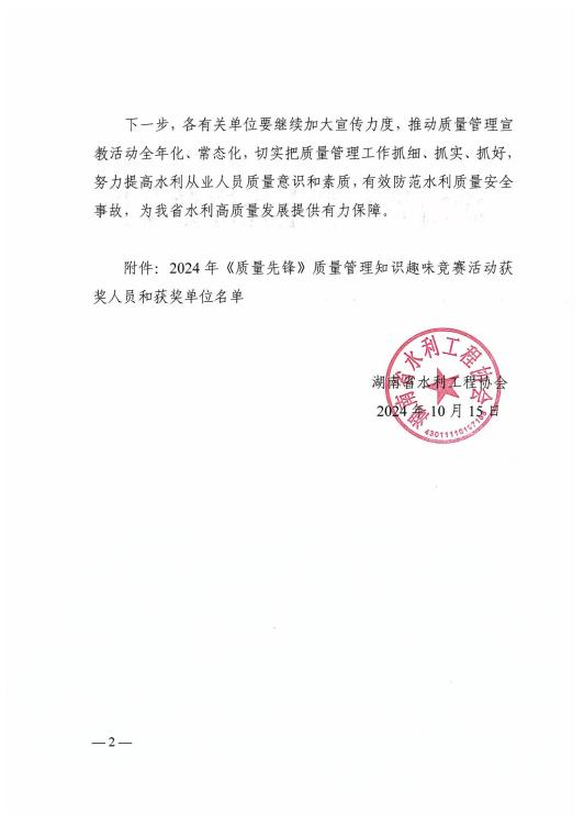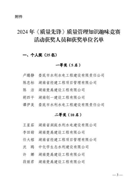 近日,湖南省水利工程協(xié)會(huì)舉辦了2024年“質(zhì)量先鋒”質(zhì)量管理知識(shí)趣味競(jìng)賽,華緯水電公司憑借卓越的質(zhì)量管理實(shí)力和出色的團(tuán)隊(duì)表現(xiàn),榮獲“質(zhì)量先鋒”優(yōu)秀組織獎(jiǎng)的稱號(hào)。同時(shí),公司杰出員工黃帥同志獲得個(gè)人二等獎(jiǎng)。