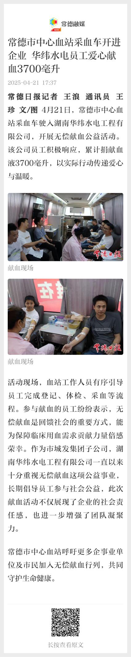 《常德日?qǐng)?bào)·常德融媒客戶端》刊登《常德市中心血站采血車開(kāi)進(jìn)企業(yè)華緯水電員工愛(ài)心獻(xiàn)血3700毫升》的文章,報(bào)道了我司這次無(wú)償獻(xiàn)血的事跡,以下為報(bào)道內(nèi)容: